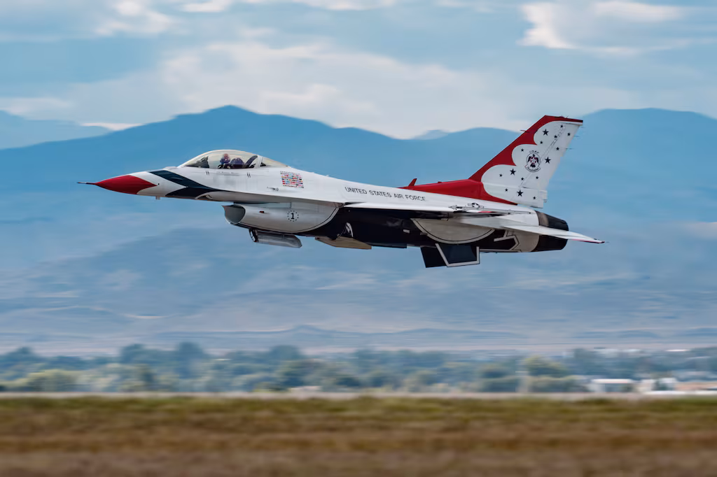 Formed in 1953, the Thunderbirds practice seasonally out of Nellis Air Force Base near Las Vegas. Aircraft based there include F-16 Falcon and F-22 Raptor fighter jets as well as A-10 Warthog ground-attack jets.